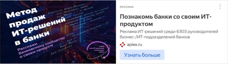 Альтернативный путь донесения рекламного сообщения - таргетинговая реклама по целевым контактам - сотрудникам банков - руководителям бизнес и ИТ-подразделениям влияющих на принятие решений о закупке банковского ПО. При этом подходе реклама показывается целевому контакту на множестве сайтов независимо от интересов и запросов пользователя. Даже если специалист от банка просматривает спортивные новости на специализированном сайте - реклама будет показана. О вашем решении в рекламном сообщении будет напоминаться круглосуточно. Только отобранным пользователям - сотрудникам банков. Постоянно.